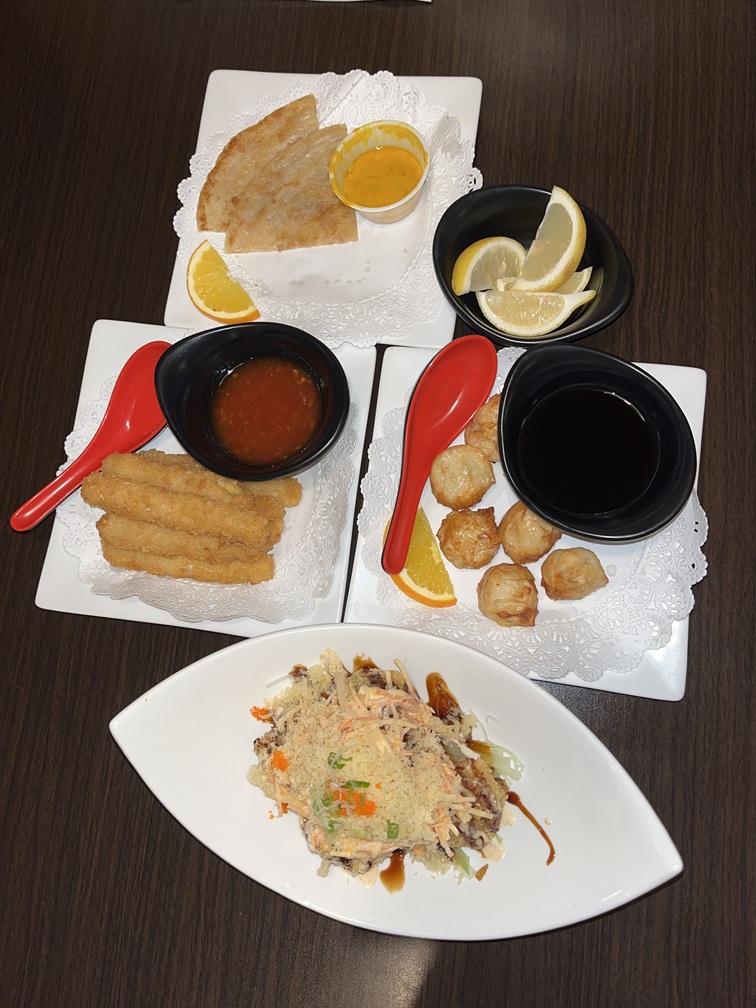 We got the dancing scallops, Malaysian Roti, Fried Shumai, and the calamari. Orange slices were served with each plate, a single slice on the corners. Which helped the color and presentation and gave a little something more to chew on between bites.