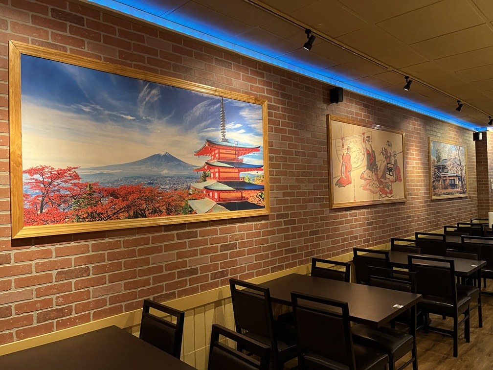 There was a full bar with liquor. The walls were adorned with large images that were framed like paintings. Anime was playing on a screen over the bar. The restaurant was a bit slow this evening, being a Tuesday.
